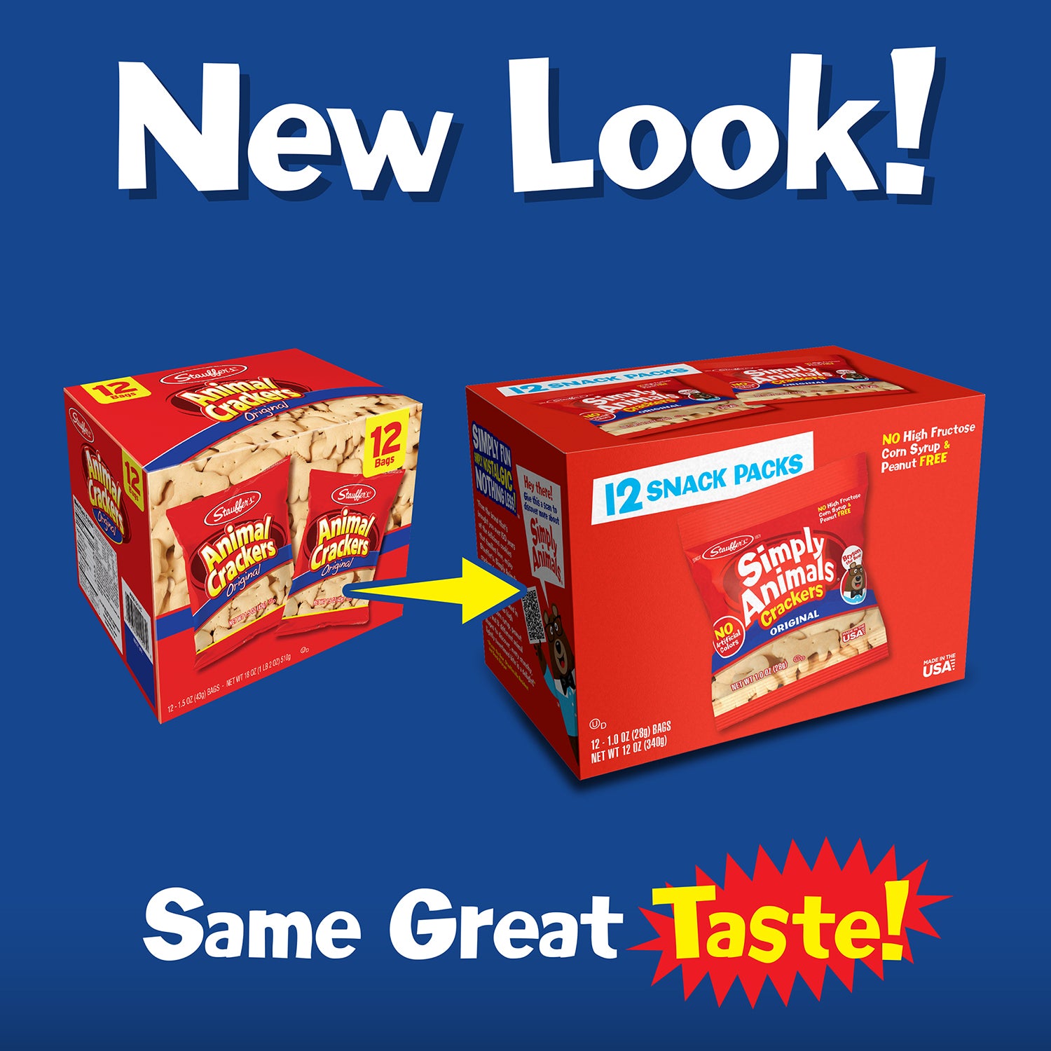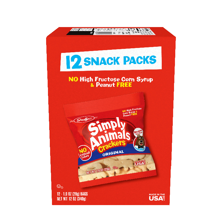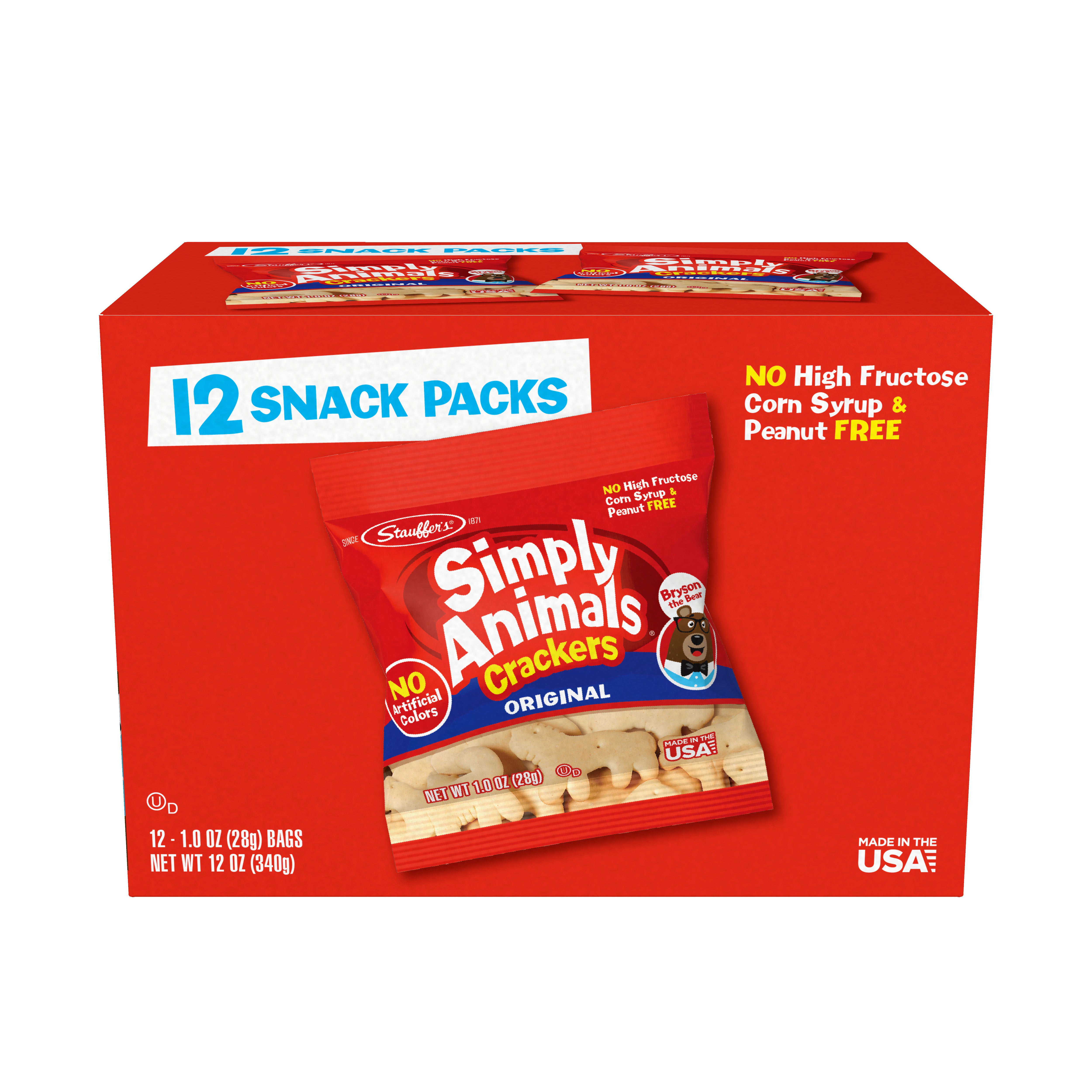 Snack smart with Stauffer’s Simply Animals Original animal crackers in a 12-pack of 1oz bags. Perfect for lunchboxes, school snacks, or portion-controlled treats, these crunchy classics feature 13 playful shapes and are baked in the USA with no high fructose corn syrup or artificial colors.